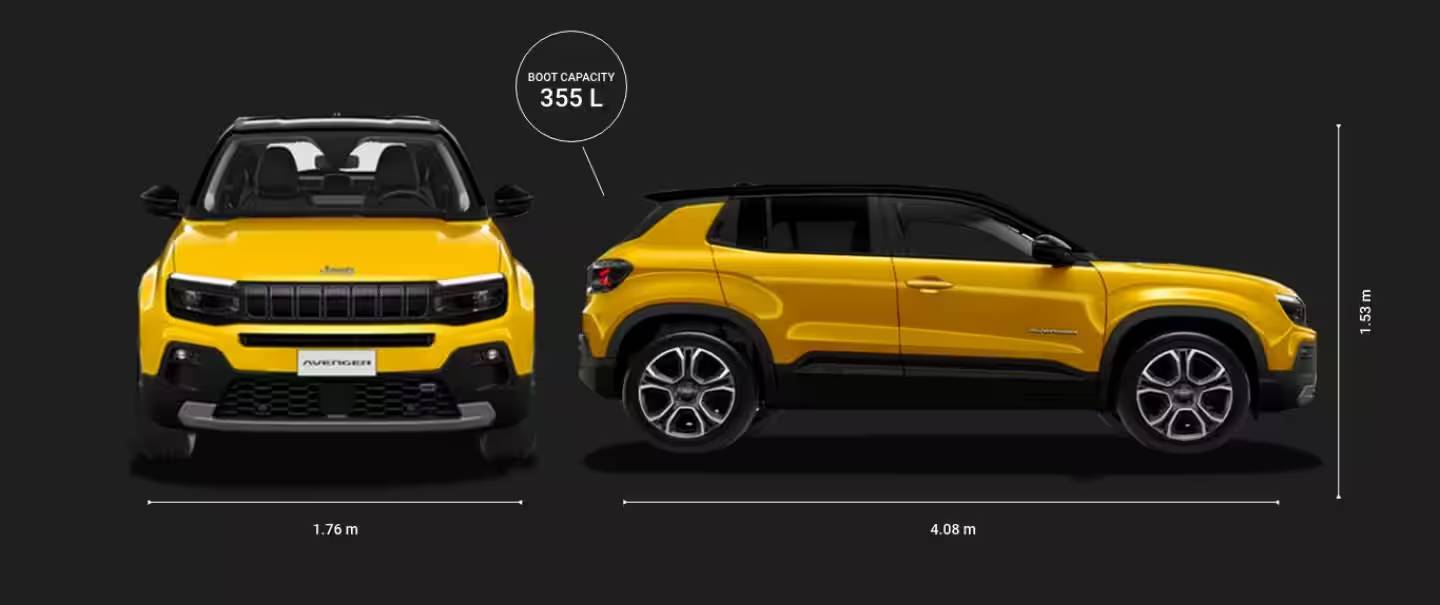Jaunais Jeep Avenger piedāvā komfortu un plašumu, kas Jums nepieciešams katrā braucienā, tostarp ekstrēmākajos piedzīvojumos. Izmēru ziņā jaunais Jeep Avenger ir līdz 1,53 m augsts, savukārt tā garums ir 4,08 m, bet platums – 1,72 m.