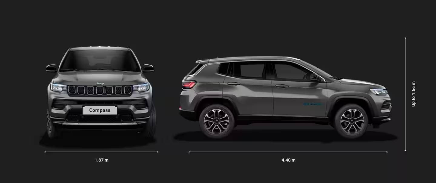 Jaunais Jeep® Compass 4xe Plug-in Hybrid piedāvā komfortu un vietu, kas nepieciešama katrā ceļojumā. Ieskaitot pat ekstrēmākās ekspedīcijas. Izmēru ziņā jaunais Jeep® Compass 4xe Plug-in Hybrid ir līdz 1,66 m augsts, bet tā garums ir 4,40 m, un šis 4x4 uzlādējamais hibrīds ir 1,87 m plats.