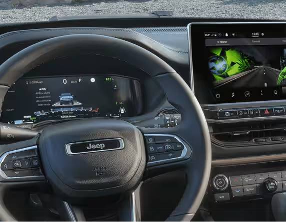 Jeep® e-Hybrid mobilitāte piedāvā jaunu vadības pieredzi. Salīdzinot ar tradicionālo vieglā hibrīda sistēmu, Jeep® e-Hybrid tehnoloģija nodrošina pilnīgu hibrīda braukšanas pieredzi, iesaistot elektrodzinēju*, kas garantē momentānu griezes momentu pat pie zemiem apgriezieniem.