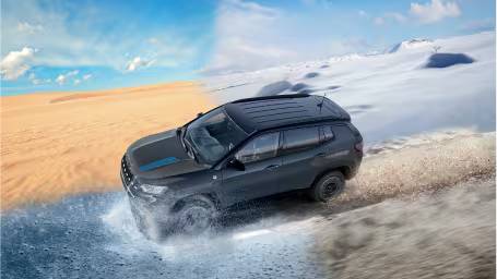 Ar jauno Compass varat pārvarēt jebkuru ceļu, pateicoties tā bezceļam piemērotajiem buferiem* un speciālajām aizsargplāksnēm**. Turklāt Jūs varat izvēlēties kādu no trīs dažādiem braukšanas režīmiem, kas darbojas ar enerģiju no elektrodzinēja, benzīna dzinēja vai abiem kopā. Abu dzinēju kombinēta izmantošana nodrošina uzlabotu veiktspēju un samazinātu degvielas patēriņu.